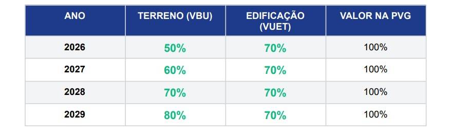 A Prefeitura não aplicará 100% dos valores da PVG. O teto máximo será 80% para terrenos e 70% para edificações, mesmo após os 4 anos de transição. Além do escalonamento: redução de alíquotas em todas as faixas (entre 0,10 e 0,20 pontos percentuais).