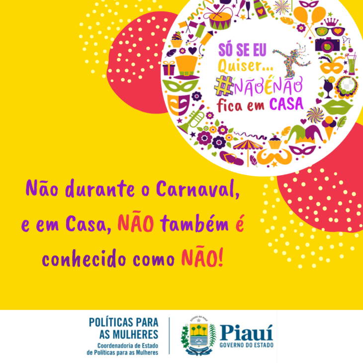 A Coordenadoria Estadual de Políticas para as Mulheres (CEPM) lança a campanha para o período de Carnaval “Só se eu quiser…#nãoénão – Fica em Casa”. Em 2022, a fim de evitar aglomerações no período carnavalesco, o governador Wellington Dias assinou o decreto nº 20.525, que determina a suspensão de festas e eventos pré-carnavalescos e o Carnaval, em ambientes abertos ou fechados promovidos por órgãos públicos ou iniciativa privada.