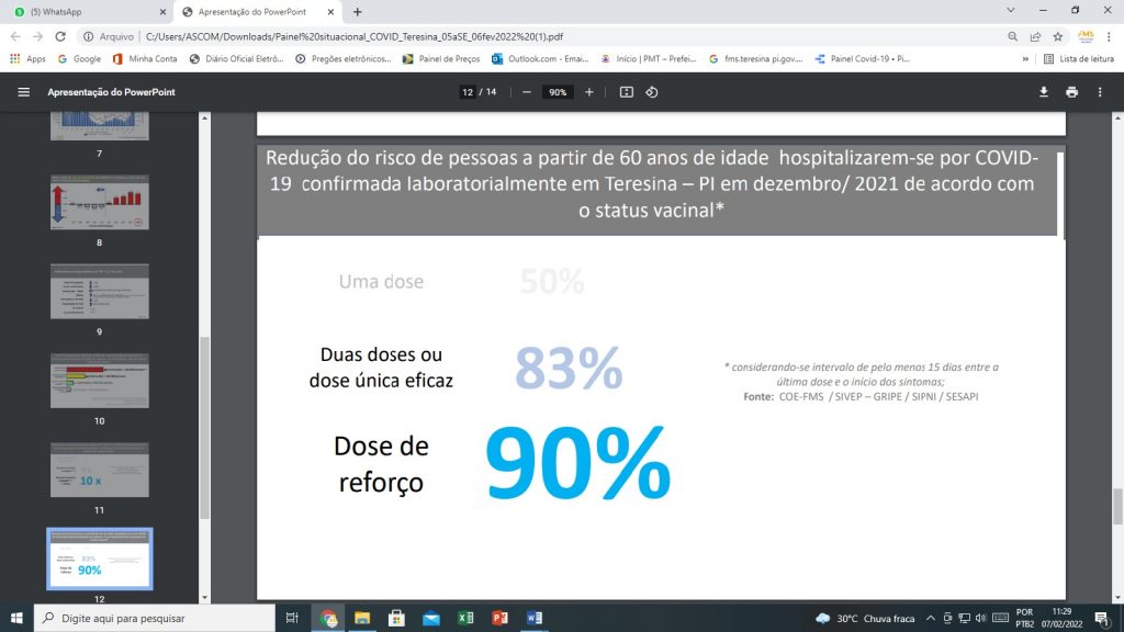 O dado positivo desse período foi a constatação da redução da hospitalização por covid-19 para quem tem o esquema vacinal completo a partir de 60 anos. Quem está com as duas doses e mais a de reforço da vacina, a proteção chega a 90% e redução de internação é de 10 vezes. Com as duas doses ou dose única a proteção é de cerca de 83% e a redução de internação é de seis vezes, já com o esquema vacinal incompleto ou com uma dose é de 50% o risco de internação.