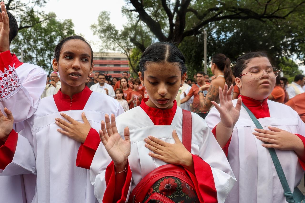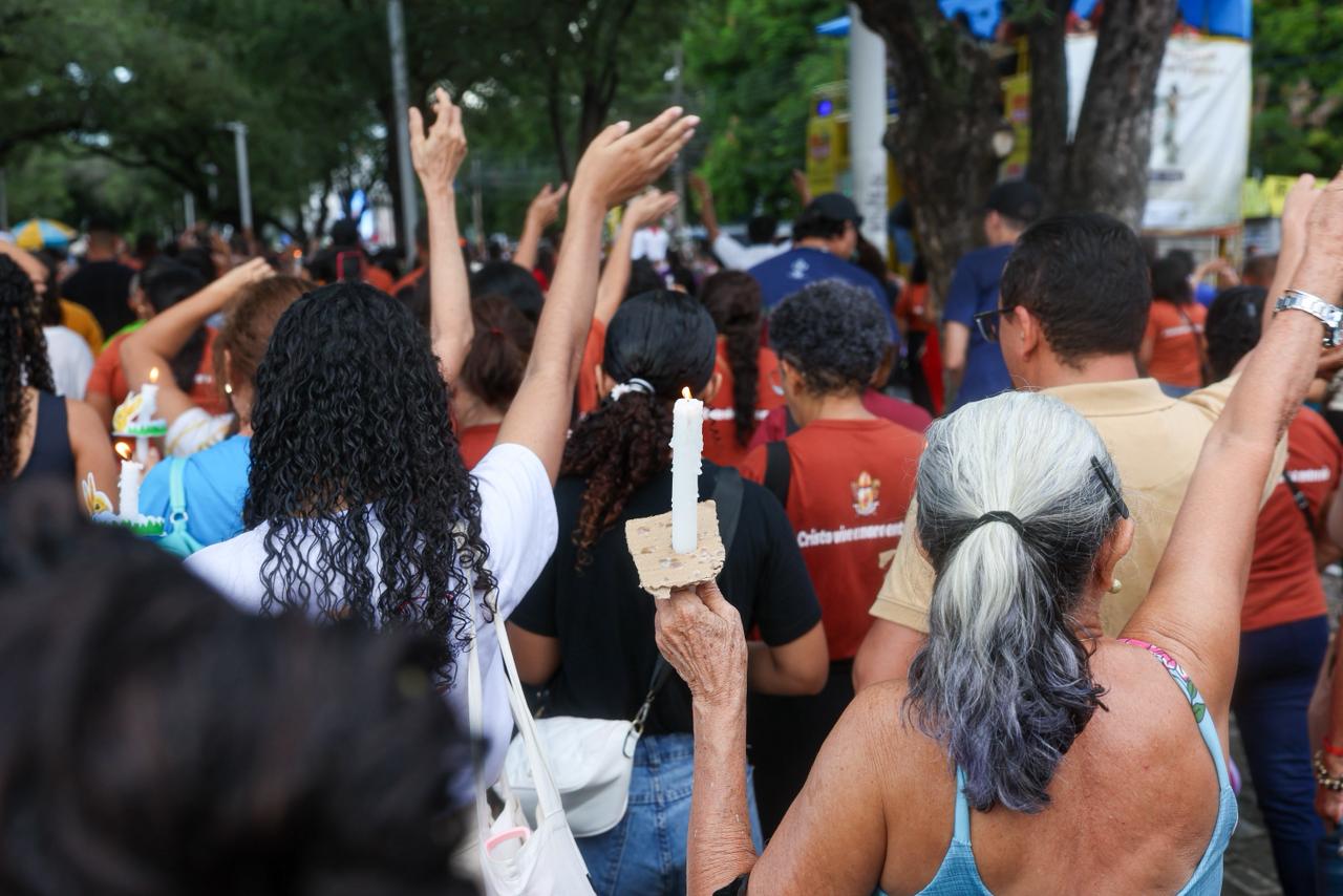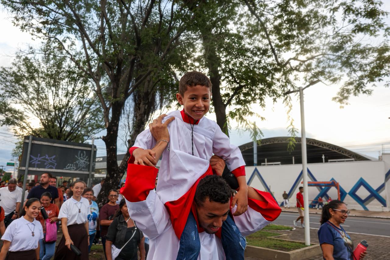 A programação teve início às 16h, com concentração e bênção de velas no adro da Igreja São Benedito, na Avenida Frei Serafim. Depois, os participantes seguiram em procissão até o Parque Potycabana, onde foi celebrada a Santa Missa Solene, presidida pelo arcebispo de Teresina, Dom Juarez Marques.