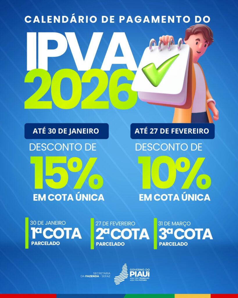 “O governo do Piauí facilita o pagamento do IPVA 2026 ao oferecer descontos para quem opta pela cota única, além da possibilidade de parcelamento em até três vezes e pagamento via cartão de crédito. Os valores arrecadados retornam à sociedade por meio de investimentos que geram melhorias e benefícios diretos para a população piauiense”, destaca o secretário da Fazenda, Emílio Júnior.