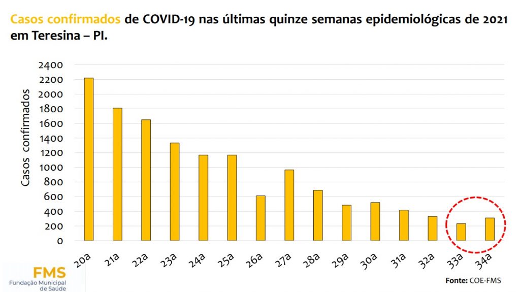 O número de casos de covid-19 em Teresina teve um aumento de 34% na 34ª Semana Epidemiológica (22 a 28 de agosto). O dado consta no painel do Centro de Operações Emergenciais (COE), da Fundação Municipal de Saúde (FMS), que alerta para a necessidade das pessoas seguirem os protocolos para combater o avanço da covid-19 na capital.